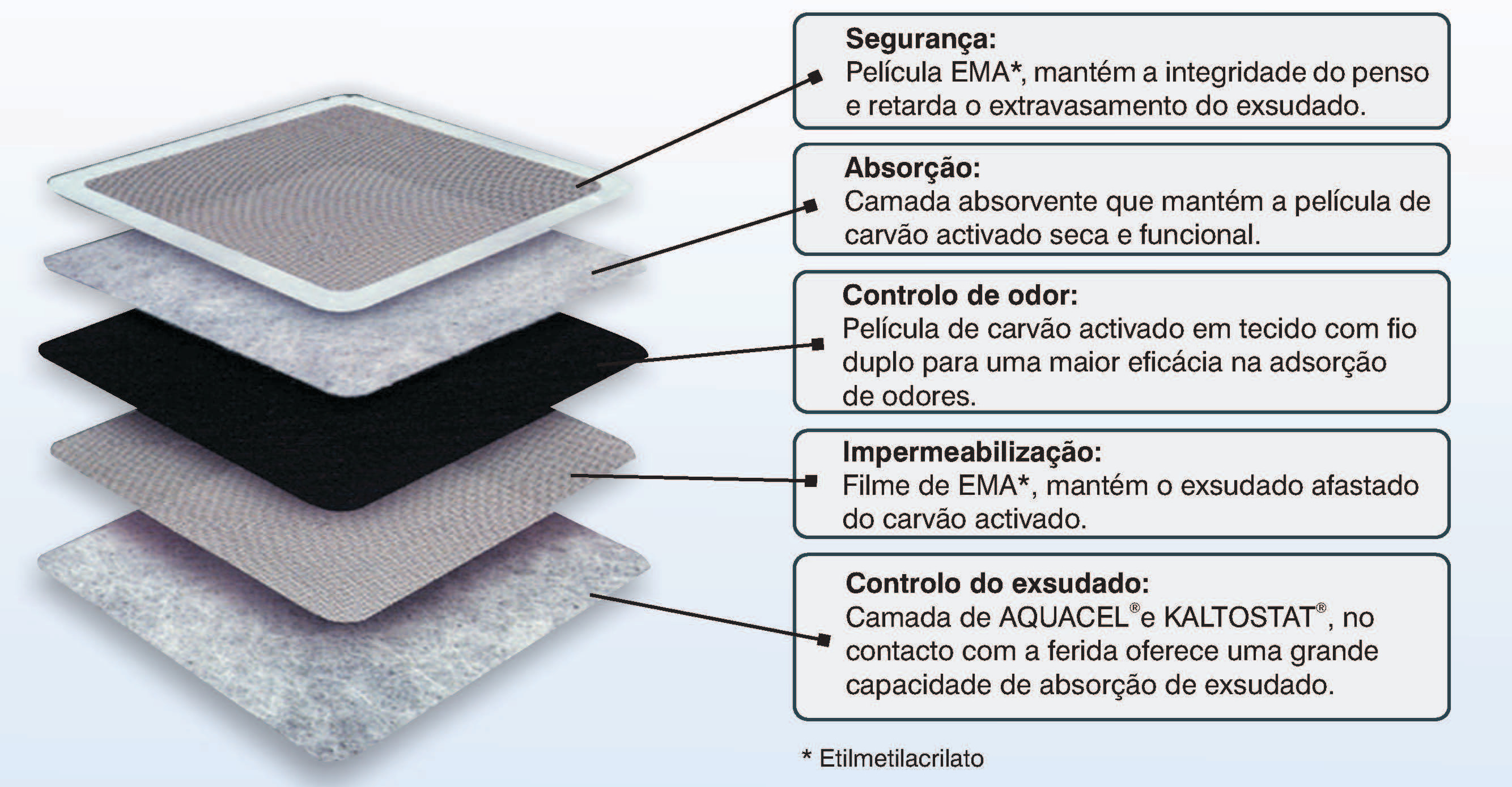 O penso CarboFlex® é um penso estéril, não aderente indicado para ser utilizado como penso primário em feridas superficiais ou como penso secundário em feridas cavitadas que necessitem de preenchimento. É um penso de cinco camadas especificamente desenvolvido para a gestão de feridas com odor. Este penso apresenta uma camada de contacto absorvente, uma camada de carvão activado como camada central e a camada de película EMA, que mantém a integridade do penso e retarda o extravasamento do exsudado.